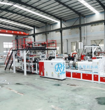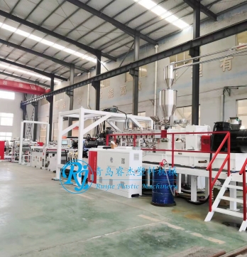 PET片材生產(chǎn)線PET片材生產(chǎn)線是我公司結(jié)合多項生產(chǎn)工藝配方體系,鞏固研發(fā)出的一種免結(jié)晶干燥新型擠出片材生產(chǎn)線。采用精密三輥壓延工藝技術,減少了原料的粘度,提高了冷卻效率,大大提升片材的品質(zhì)和產(chǎn)量。? 生產(chǎn)線由平雙擠出機,液壓換網(wǎng),熔體計量泵,模具,斜三輥,定型平臺,靜電消除,表面涂油,牽引機,分割機,收卷機等。> -